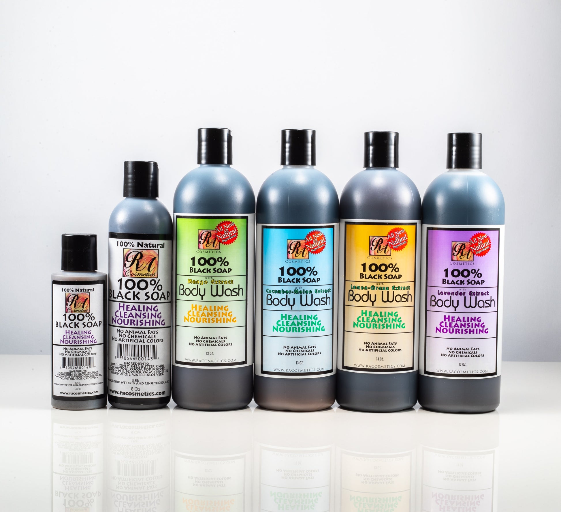 Our RA Cosmetics 100% Liquid All-Natural Black Soap is made in West Africa from palm ash, shea butter, plantain peel, camwood, distilled water, manuka honey, aloe vera, and essential oils.